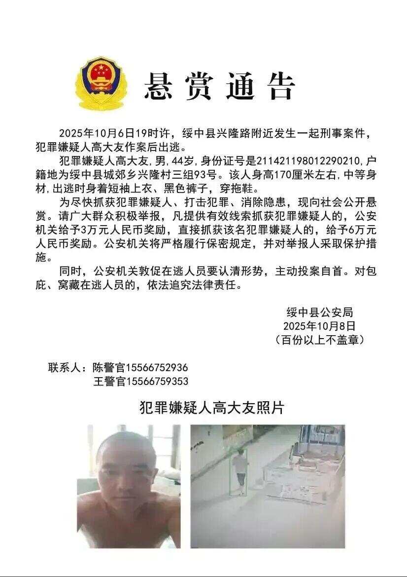 10月8日,辽宁葫芦岛绥中县公安局发布悬赏通知称,抓获犯罪嫌疑人高大有的悬赏金额将增加至6万元。 19:00左右,兴隆街附近发生一起重大刑事案件。犯罪嫌疑人高大有犯罪事实并非如此。悬赏通告信息显示,高迪今年44岁,身高约170厘米,中等身材。该男子逃跑时身穿短上衣、黑色裤子和拖鞋。其身份证号为211421198012290210。7日-7日,县公安局发出协助侦查通知书,悬赏最高5万元。 9日,有消息称,负责此案的警方回应称,将处理此案,具体细节尚未掌握。据此前媒体报道,8日上午,部分商户、村民和学校工作人员告诉兴隆路,收到安全提醒来自警察或村庄,知道有人被杀。具体事件尚不清楚。来源 |九派新闻,人物关注